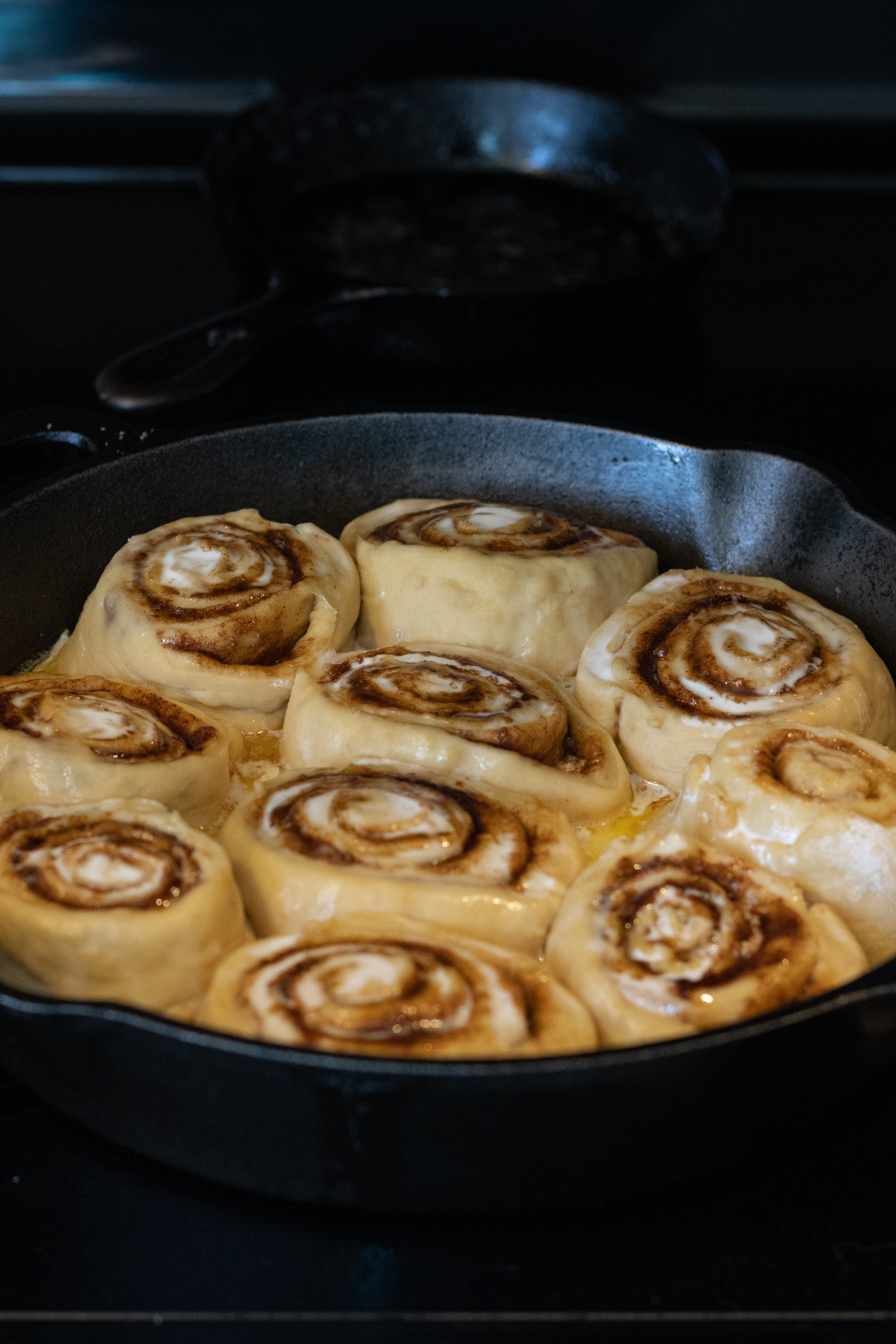 - 8. Preheat a cast iron skillet (or 8x10 glass baking dish) with a tablespoon butter on bottom of the pan. Then add the 10 cinnamon rolls semi close together.